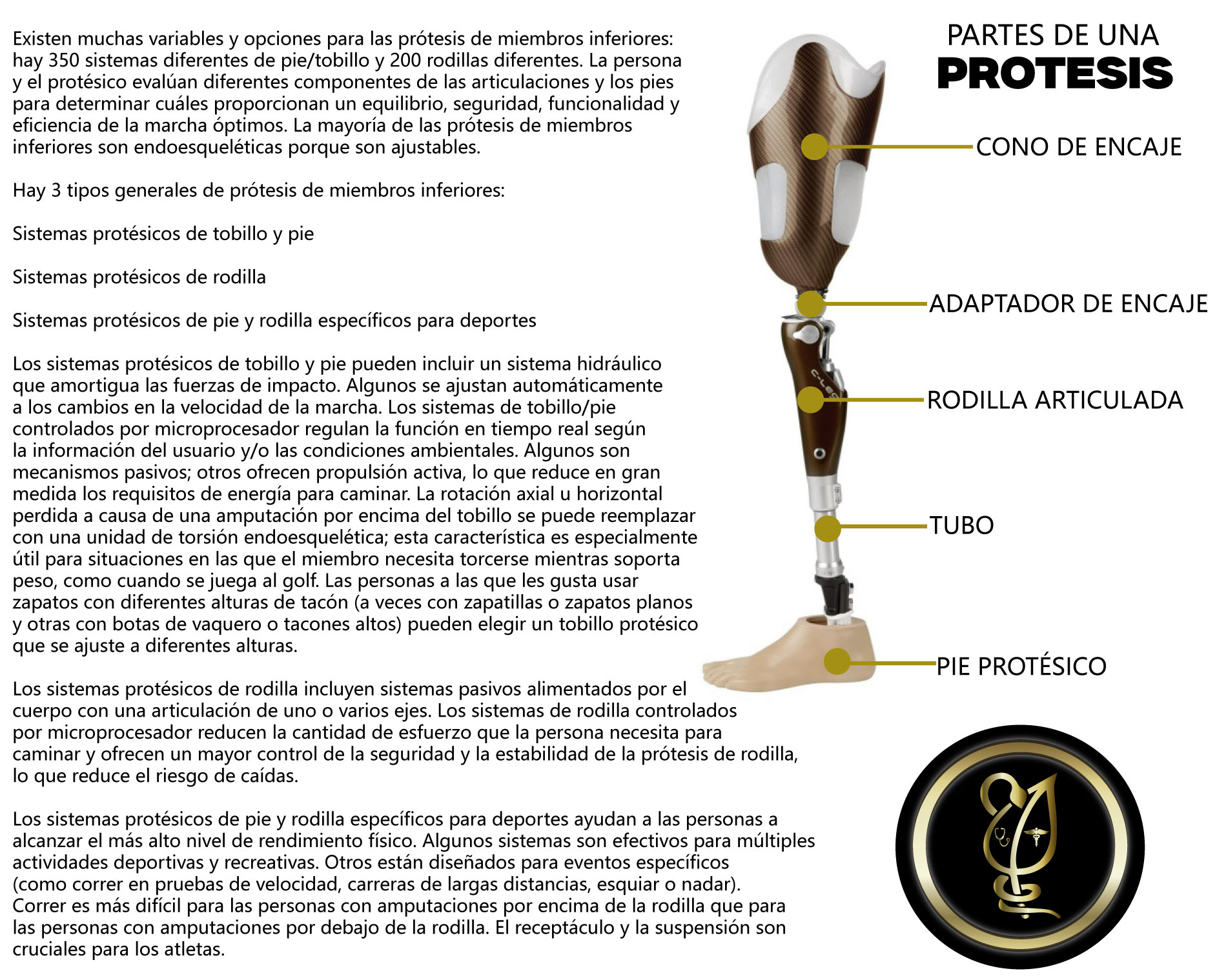 Una prótesis para amputación transtibial permite mejorar la eficiencia y el patrón de marcha, permitiendo el apoyo estático y el dinámico, logrando una amortiguación de los impactos del peso corporal durante la marcha y consiguiendo un buen anclaje-suspensión de la prótesis durante la oscilación y una buena estabilización durante el apoyo, además de una función estética.